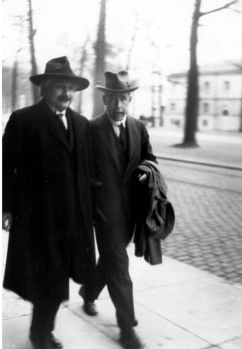 在回宾馆的路上,爱因斯坦笑容满面,大步流星,而玻尔大惊失色,亦步亦趋,劝说道:“你可不能设计这个实验啊,否则,量子力学可就完蛋了。”(见下图)