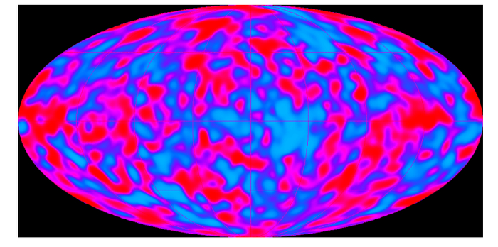 图:COBE卫星观测到的“宇宙微波背景辐射”分布图,称之为“上帝脸上的皱纹”。这项发现获得了2006年诺贝尔物理学奖,证明了宇宙大爆炸理论成立。