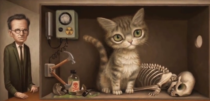 假设把一只猫和一个量子装置关在盒子里。装置里有一个放射性原子和一个毒药瓶。如果原子衰变,就会把毒药瓶打破,把猫毒死;如果它不衰变,毒药瓶就不会破,猫就继续喵喵叫。