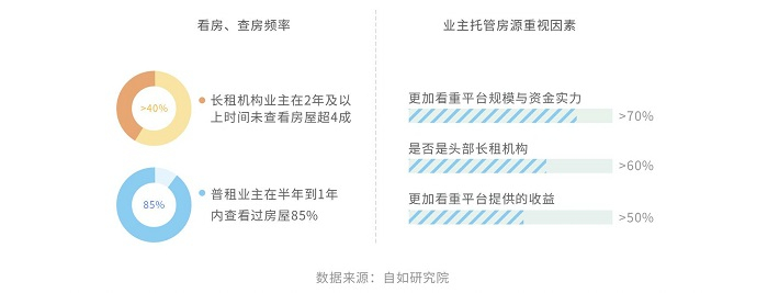 从出租行为数据来看,在出租房屋遇到的问题上,相比于传统普租业主,长租机构业主表示“从来没有遇到过问题”的占比是传统业主的近3倍;在看房、查房频率上,有超4成的长租机构业主在2年及以上时间未查看房屋,而在普租业主中有85%在半年到1年内查看过房屋。