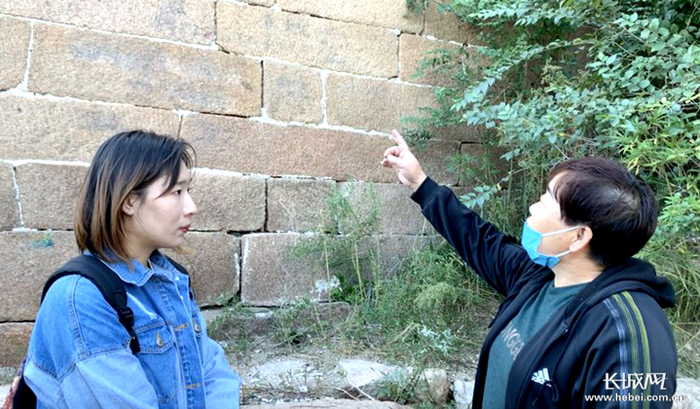 赵宛璐在听长城保护员赵雅贤讲述长城知识。青团社供图