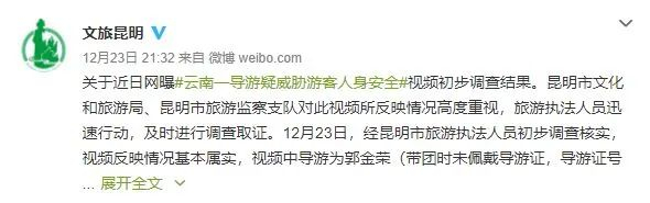 12月23日,昆明市文旅局通报称导游威胁游客人身安全视频属实,对扰乱旅游市场秩序的行为一查到底,决不姑息。