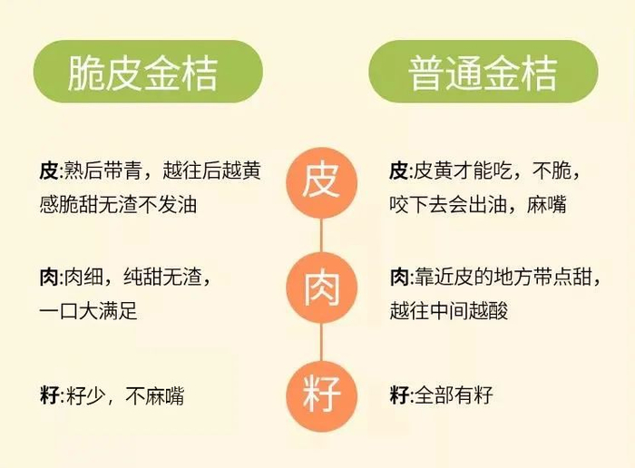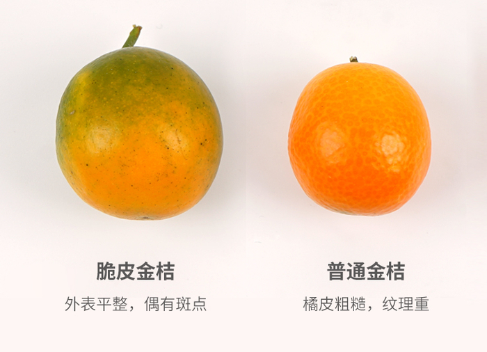 脆皮金桔,虽然脱胎进化于普通金桔,却没有导致酸麻的“油胞”,所以连皮吃时,没有呛人的桔子皮味儿,不酸麻、不苦涩。