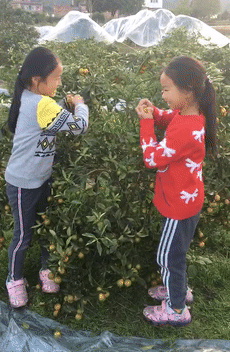 照顾园子的老果农说,他们在照料果树时经常随手摘一颗青青的金桔,在衣服上蹭蹭就塞嘴里了,孩子们嘴馋,也是这样吃过来的。