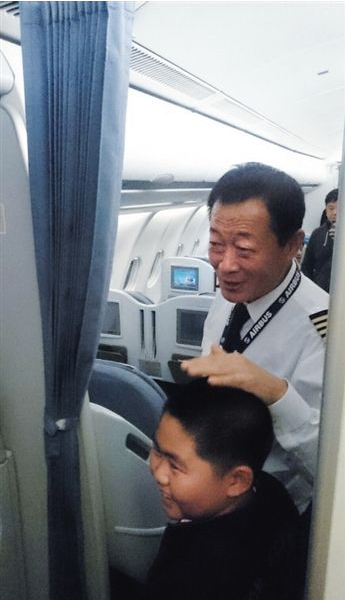2014年11月10日晚,飞机备降后,机长贺中平微笑着摸着一位男孩的头。网友供图
