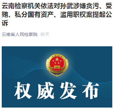 云南检察机关依法对孙武涉嫌贪污、受贿、私分国有资产、滥用职权案提起公诉