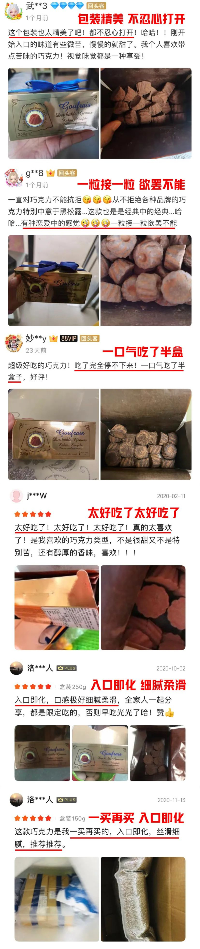 吃过它的朋友们反馈说这个巧克力吃起来“一粒接一粒”、“吃到停不下来”,真的是“一买再买”!