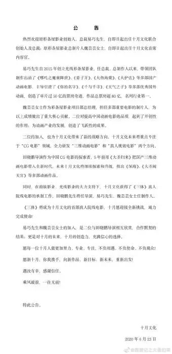 但到了当年6月,却传出了电影《三体》上映将无限期推迟的消息。同时,影片监制、出品方游族影业CEO孔二狗已离职,特效团队被更换,导演张番番拍摄的素材被废弃等传闻也相继出现。不过,孔二狗、游族影业副总裁杨璐以及导演张番番随即对此予以否认。