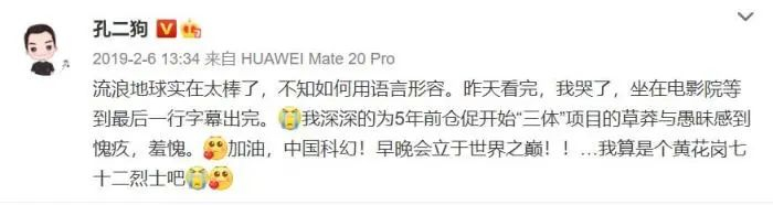 “流浪地球实在太棒了,不知如何用语言形容。昨天看完,我哭了,坐在电影院等到最后一行字幕出完。”已卸任游族网络CEO的孔二狗在其微博写道,“我深深地为5年前仓促开始‘三体’项目的草莽与愚昧感到愧疚,羞愧。”