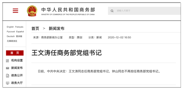 商务部官网12月2日下午发布消息:日前,中共中央决定:王文涛同志任商务部党组书记,钟山同志不再担任商务部党组书记。