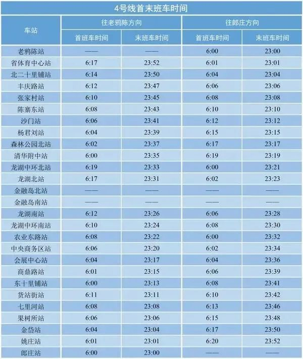 乘坐4号线平均每站花费2分钟左右,4号线目前一共是27站,有两站金融岛南站、金融岛北站暂未开通。从始发站郎庄站到终点站老鸦陈站,需要花费将近1个小时的时间。