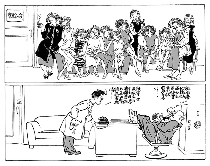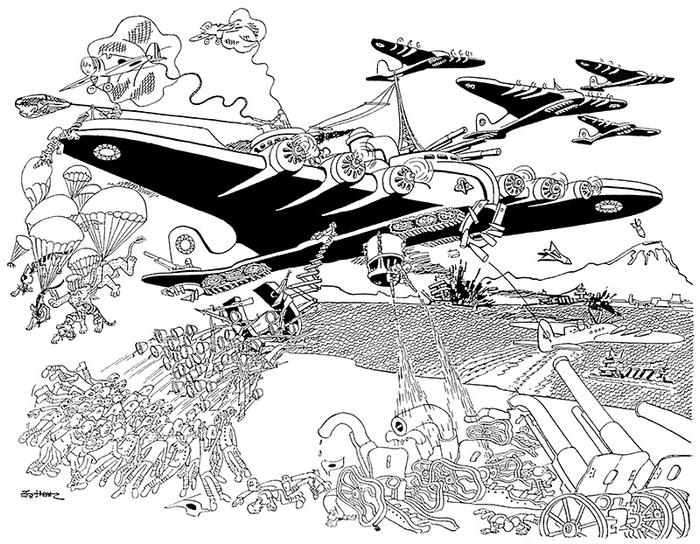 张乐平的时事漫画想象力极其丰富。站在那些画作前,仿佛能看到一位口才了得的说书先生正对世间不平嬉笑怒骂。有一些颇具科幻色彩的漫画,十分前卫和大胆,比如《想象中的无敌空军》,就非常精细地畅想了一架多功能的巨型飞机如何横扫日本国土,简直可以看作后来的动漫《太空堡垒》《天空之城》的原型,却又分明让人体会到当时国力衰弱、连战连败,只能靠想象力自我振奋的辛酸。