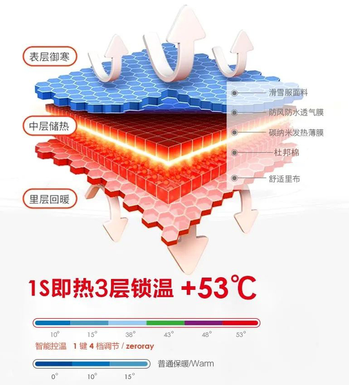 红色高温档53℃,就算零下20℃穿着也丝毫不冷!