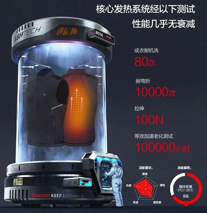 前面提到,这款发热马甲采用的是中科院纳米发热薄膜,与传统的发热材料(碳纤维、石墨烯)相比,红外发热性能更稳定,而且环保节能。