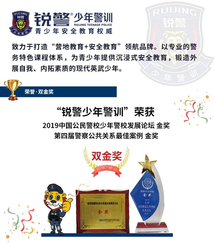 锐警少年警训是国内首家通过国际ISO9001“青少年安全&警训素质拓展”双认证的项目,联合广东警官学院、中国人民公安大学等国内知名公安院校及各地公安机关建立战略合作关系,有专业警务教学资源、强大的安全教育师资队伍,针对成长期青少年(7-16岁)成长特点、学业发展需要,特别开发的一整套针对性强、体验度佳、收获度高的夏令营,31期15万+警训队员见证成长!