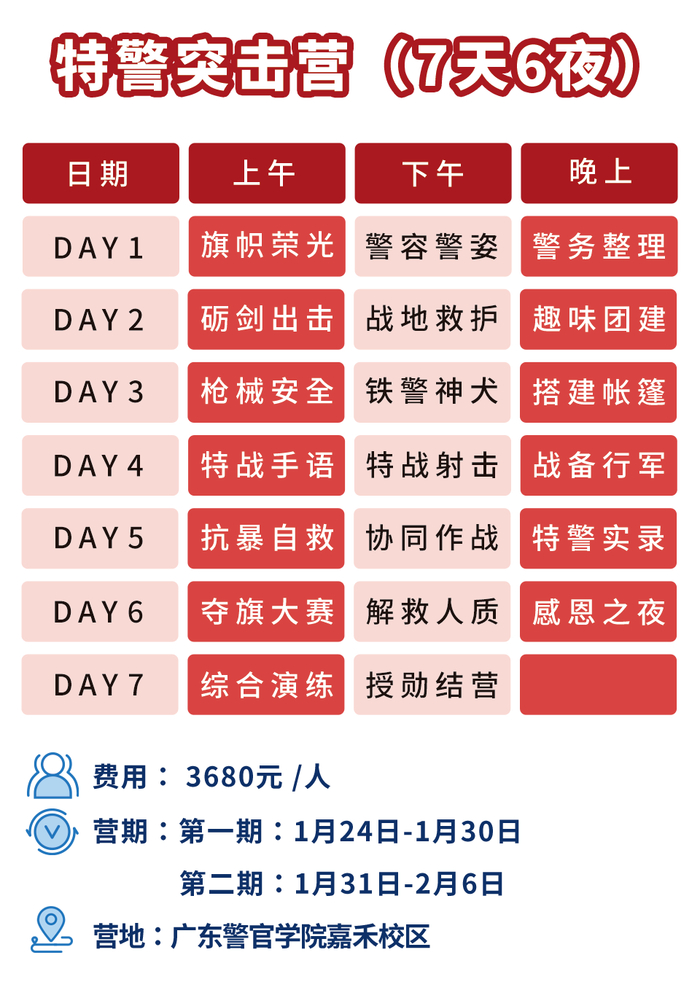 全封闭式的警营生活,让孩子全方位体验特警生活,学习积极向上、英勇果敢的特警精神,塑造成独立、自信、坚强的优秀少年。