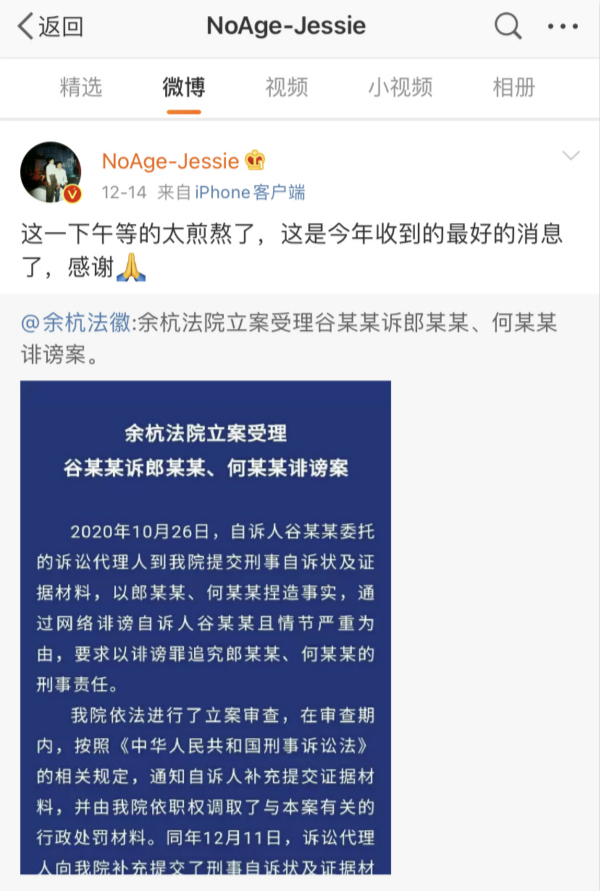 下午5时许,天黑了。吴突然收到网友发来的截屏,说余杭区法院官方微博和微信公众号发布了立案通告,称“本案符合刑事自诉案件的受理条件,我院于12月14日立案受理”。