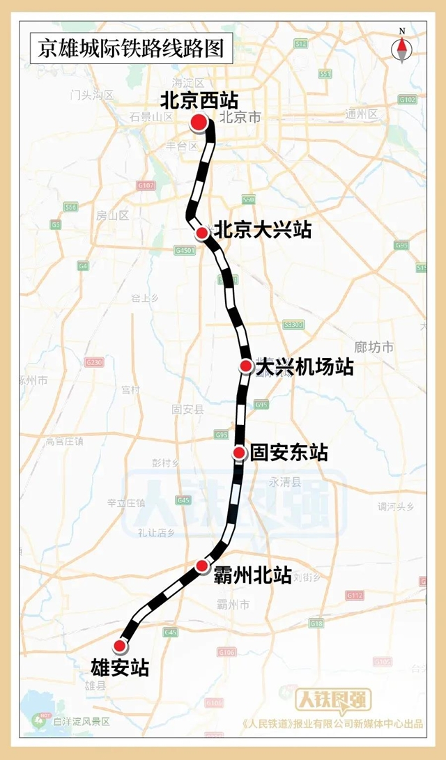 京雄城际铁路自北京西站引出,经过既有京九铁路至李营站,接入新建高速铁路线路,向南途经北京大兴区、河北省廊坊市、霸州市至雄安新区,线路全长91公里,最高设计时速350公里。其中,北京西至大兴机场段已于2019年9月26日开通运营。