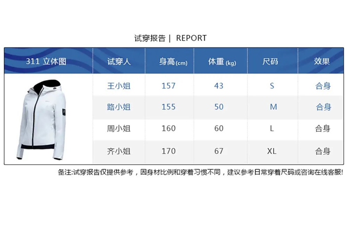 区别于男款的纯黑色、纯蓝,女款的白色更加修身、时尚。