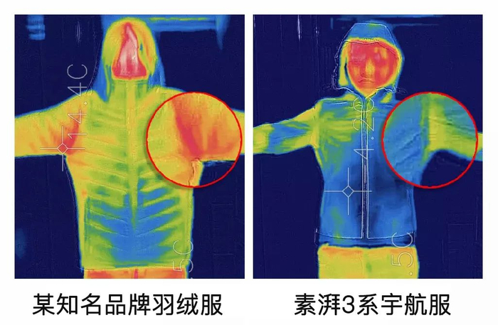 羽绒服,腋下已经泄露了不少热量。3系抗寒服锁温效果明显更好!