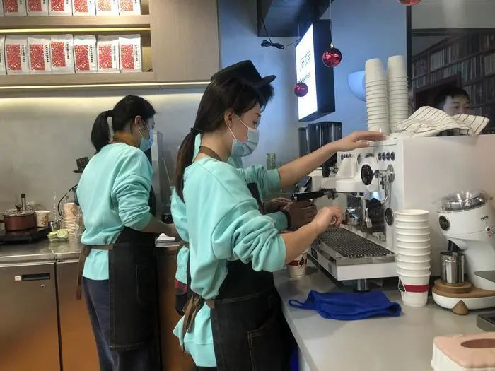 娴熟研磨咖啡豆、萃取咖啡、打奶泡、细致地拉花……伴随店内四溢的香气,一杯杯浓醇的咖啡制作完毕。记者在现场看到,6名老板穿着蒂芙尼蓝色卫衣,系着围裙,制作起咖啡来动作迅速又干练。虽然听不见也没办法对话,全程用眼神和手语交流,但他们脸上始终都挂着微笑。