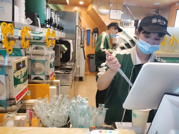 两名学生在南宁一家奶茶店购买饮品,饮品配有塑料吸管 卢丽婷 摄
