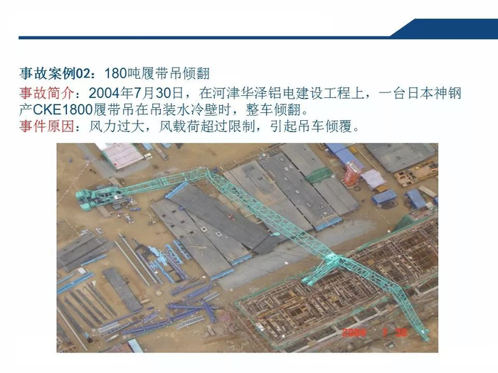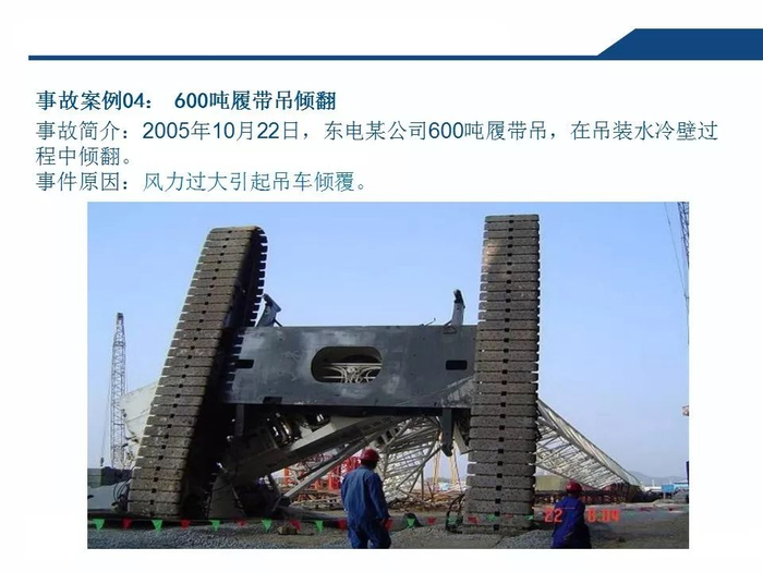 露天未安装完的龙门吊等起重设备没采取可靠的封固措施,使用中暂停的塔吊吊钩没升到安全位置或锚封在较轻的重物上等,一阵风刮来便可能造成事故,有时突然出现阵风暴雨使电源短路,想抬钩都来不及。所以,养成良好的施工作业习惯非常重要。再有,风天大件吊装必须要考虑风载对吊车的影响因素,有危险或风力超过安全规定时不要作业。