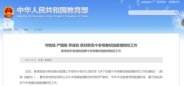 此前,教育部应对新冠肺炎疫情工作领导小组办公室印发的通知要求,各地各校要及早谋划寒假和春季开学安排,统筹常态化疫情防控和教学科研工作。