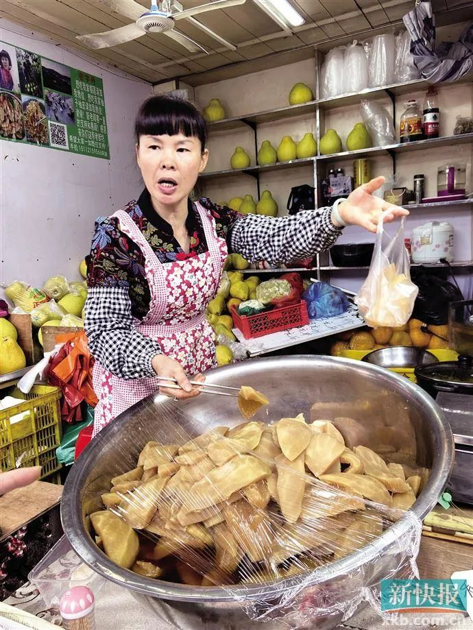 在沙园菜市场水果区有一档阿妹金果行,卖水果,主打卖柚子。不过,新快报记者发现,它卖半成品柚子皮生意更好。同行的越秀区食品商会副会长、美食家刘展明介绍,柚子皮煮鱼、煮烧肉,是地道的粤菜。档主善用资源,将一般人扔掉的柚子皮加工成食品,大受欢迎,说明档主聪明。