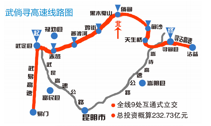 武倘寻高速公路起于武定县杨柳河村,接已建成通车的武定至易门高速公路,与京昆高速公路(G5)交叉,通过武易高速的武定枢纽互通进行交通转换,止于寻甸县天生桥,与嵩待高速公路交叉,接寻甸至沾益高速公路(今年12月28日通车)。项目同时作为京昆高速公路(G5)和银昆高速公路(G85)的横向连接线。项目主线全长105.28公里,其中,昆明市境内有99.18公里,楚雄州境内有6.1公里。项目全线采用双向6车道高速公路标准建设,设计时速100公里,路基宽33.5米,批复概算总金额232.73亿元。