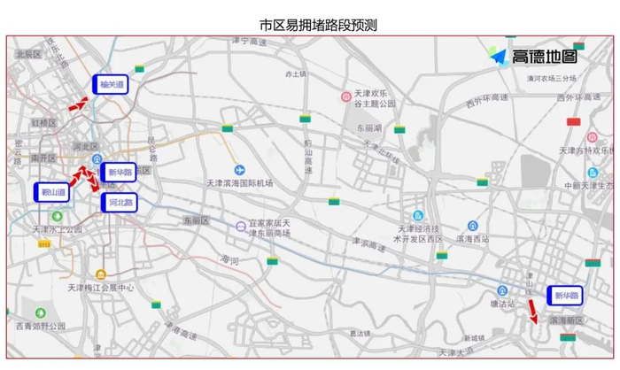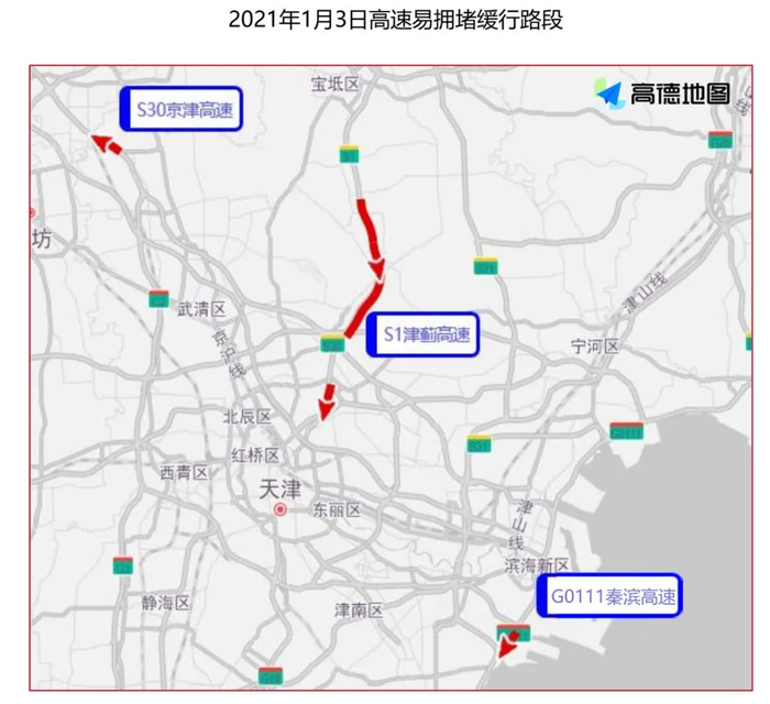 出程高速易拥堵缓行路段预测方面,根据高德地图交通大数据预测,元旦期间天津市出程易拥堵缓行的高速主要是S50津晋高速、G18荣乌高速、 G0111秦滨高速等高速的部分路段。返程高速易拥堵缓行路段预测方面,根据高德地图交通大数据预测,元旦期间天津市返程易拥堵缓行的高速主要是S30京津高速、S1津蓟高速、 G0111秦滨高速等高速的部分路段。
