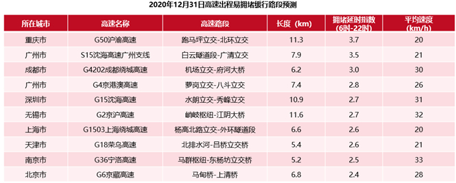 全国高速易缓行路段较为分散,2020年12月31日出程易拥堵缓行的高速路段前三依次为:G50沪渝高速重庆段,预计拥堵延时指数为3.7,平均车速约为20千米/小时;其次是S15沈海高速广州支线、G4202成都绕城高速。返程方面,易拥堵缓行高速路段中,广东省占6席,其中最易拥堵的高速路段前三为:G15沈海高速南通段,预计拥堵延时指数达3.9,平均车速为24千米/小时,其次是G75兰海高速重庆段,G15沈海高速深圳段。