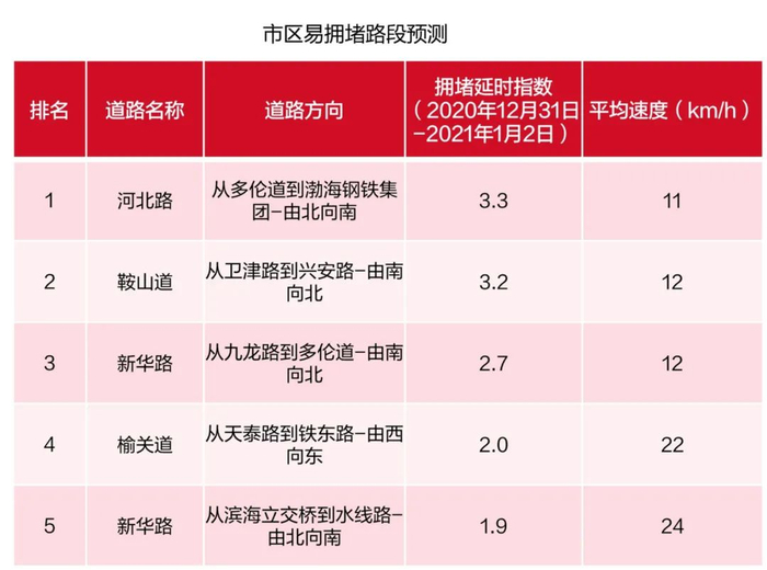 元旦期间城区易拥堵道路预测方面,预计节日期间市区部分路段易发生拥堵,其中包括河北路、鞍山道、新华路、榆关道等。