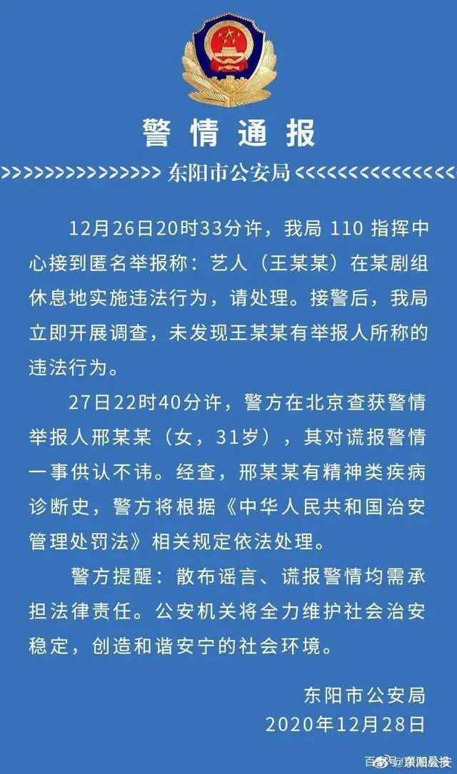 12月28日,@东阳公安 通报王一博被报假警结果:“警方在北京查获举报人邢某某(女,31岁),经查,该女子有精神类疾病诊断史,将根据《中华人民共和国治安管理处罚法》相关规定依法处理。”同时警方提醒:“散布谣言、谎报警情均需承担法律责任。”