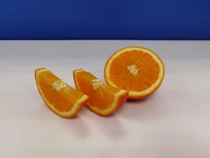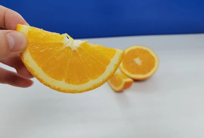 切:赣南脐橙呈橄榄球状,“拦腰”切开的样子最好看,适合摆盘,一看就是“多汁多漂亮”;你也可以从“脑袋”处先横切下一小片,然后纵向切开,这样利于剥皮,食用的时候不会让汁水涂满脸。