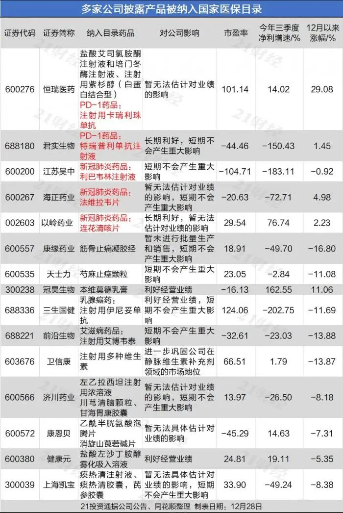 几家欢喜几家愁。12月28日A股盘后,多家医药上市公司发布公告,宣布自家产品被纳入或保留在国家医保目录。