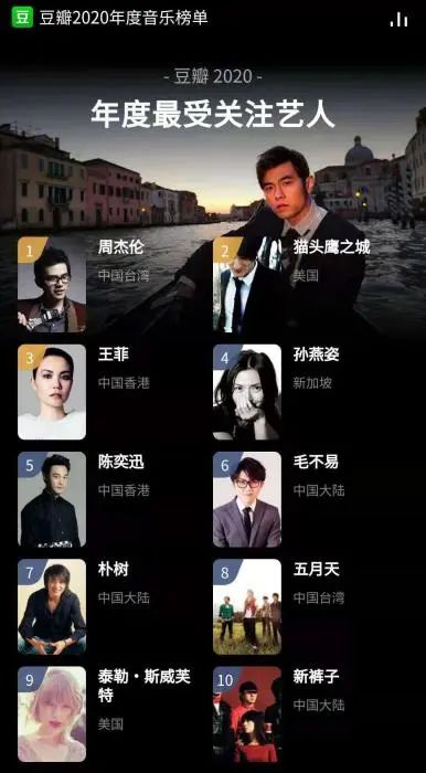 不久前,豆瓣发布2020年度音乐榜单,其中,在年度最受关注艺人一栏,人们发现了熟悉的名字:周杰伦、王菲、孙燕姿、陈奕迅、朴树、五月天、新裤子乐队……