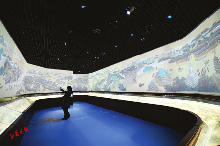 走入该展厅,率先引入眼帘的就是一幅动态影像,上面显示了晋商开辟的“万里茶路”路线图。一个个地标城市逐一跳跃呈现,汇聚成了这条影响颇远的商路,呈现出中国古时的商贸传奇,让人唏嘘感慨。顺着展厅走,眼前豁然开朗,只见一幅名为《万里茶路》的画作瞬间展开,与墙壁浑然一体。整幅画作长25米、宽8米,每一个细节及画作笔触背后的历史人文,用声音、视效、图像解析的交互方式“活化”在参观者的视线之中,更为巧妙的是,画作中这条旅程还会“黑夜与白天”变换,人物、船舶、车马、动物、建筑等手段,瞬间都“活动”起来,让参观者“走入画中的世界”。高卓然告诉山西晚报记者,他们还专门为展厅特殊设计音效追踪系统,使得声音的呈现与参观者同步,让人身临其境。