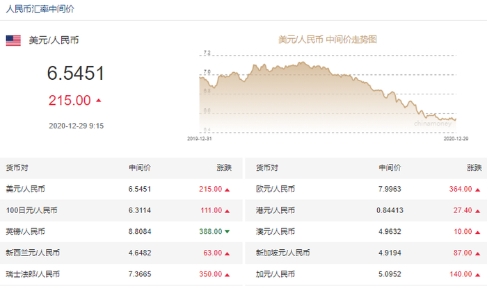 12月29日,人民币兑美元中间价报6.5451,调贬215个基点;前一交易日中间价报6.5236,在岸人民币16:30收盘价报6.5375,23:30夜盘收报6.5383。