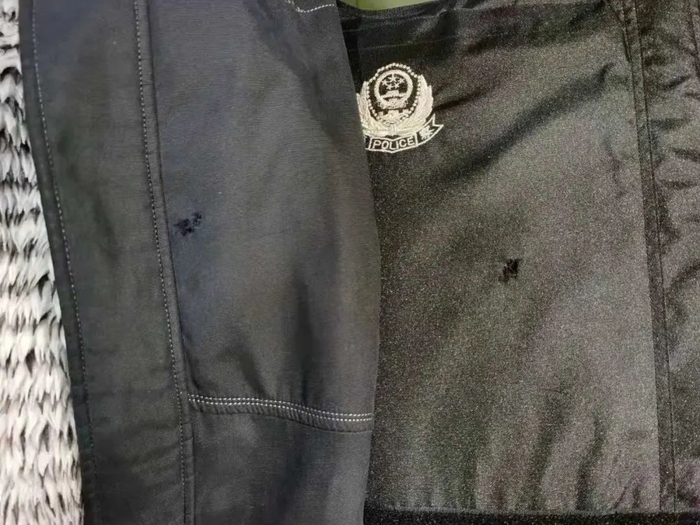 增援警力到达现场后,李永飞才感觉到胸部阵阵疼痛,他揉了揉胸口,只见外套上有个食指大的弹孔,防弹背心上有处凹痕。他没有多想,继续坚持在外围警戒。