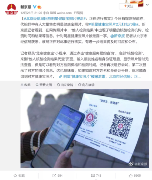 据报道,针对明星健康宝照片被泄露一事,记者从北京市经信局获悉,该局正在对此事进行核实。