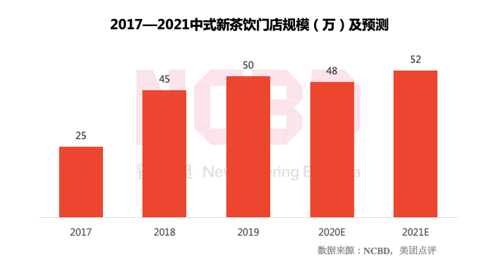 NCBD(餐宝典)数据显示,2019年中式新茶饮市场规模突破700亿元,预计到2021年,中式新茶饮市场规模将突破1000亿元大关。在门店数量上,2020年中国现制茶饮门店数量预计达到48万家,2021年达到52万家。