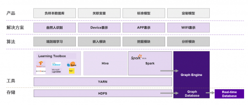 最下面是存储层,将数据从传统的关系型数据库导入到图数据库里面去,并且有一部分图数据库是支持实时计算的。往上一层是工具层,最右面是融慧金科的生态伙伴提供的图计算引擎,相当于在整体的架构里面提供一个非常强劲的发动机。有了这样一个发动机之后,可以配备左边这些开源的计算工具,比如像Google和Facebook的深度学习计算框架。也会利用Spark做一些离线的分析。第三层的算法最理想的是做端到端的学习,当然也支持一些嵌入式学习或者做一些挖掘和分析模块。具体到解决方案层会分为四个维度,分别是人的维度、设备的维度、APP的维度和WI-FI的维度。产品层最典型的就是负样本的数据库,也就是通常所称的黑名单数据库。同时还会有通过关联的特征生出来的变量,以及可以输出给各大金融机构的标准模型。最后是根据金融机构的样本去量身定制模型,这是整体底层能力的架构情况。