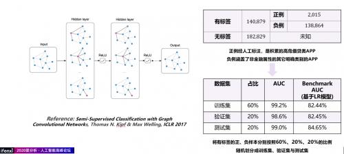 另一个案例是图神经网络模型,用了GCN的架构,它的好处是在不需要做太多人工标记的前提下能够跑出一个非常优异的模型。左边的是卷积神经网络模型的架构,参考的是2017年的一篇半监督的GCN模型架构,右边是样本情况。有标签的样本相对来说是比较少的,只有14万,大部分的18万样本没有标签,并且整体正例占比比较低。下面是实验效果对比,对比了一个基线模型,基线模型是基于传统的LR模型 ,AUC在80%左右,而GCN模型的AUC接近于满分100%。