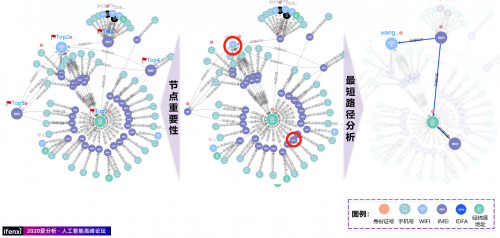 案例二体现了节点重要性以及最短路径分析,这是很经典的在图方面的算法,现在我给大家演示一下这些算法是怎样应用到业务上面。中间是一个比较大规模的团簇给拉出来了,拉出来之后如果策略分析人员想做比较高效的分析。首先可以做节点重要性的分析,比如在这张图里面最重要的五个节点,通过快速的运行算法,可以发现最中间的地理位置的图表关联的手机设备是最多的,这毫无疑问是最重要的一个节点,以及最上面的Wi-Fi的设备以及手机号IMEI,右边的手机号以及左边的手机号是排名前五的最重要的节点。基于这五个节点,策略分析人员能从一张比较大的网中抓到一些比较重要的信息。最短路径分析在这张图红圈圈出来两个,一个是一个Wi-Fi设备,第二个是一个安卓手机,我们想关心这个安卓手机是怎样跟着Wi-Fi设备以最短路径连接起来的,可以看到这台安卓手机来到某个地理位置,在这个地理位置其实另外一台设备也来过,另外一台设备其实连接了一个黑的Wi-Fi,通过最短路径分析可以非常高效的把隐藏的关系快速抓到。