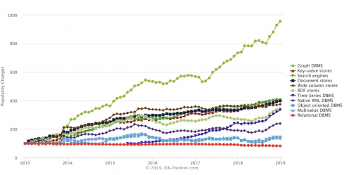 在演讲之前先给大家介绍一下过去几年图数据库的发展趋势,图数据库实际上是一个底层的数据库,支撑上层的知识图谱。横轴代表从2013年到现在的发展时间,纵轴是整个图数据库在网络上受欢迎的程度。不同的曲线对应不同的数据线,可以看到上面最陡的这条曲线呈指数级增长的就是图数据库。据尼尔森咨询的预测,这个趋势会持续到2025年。下面相对来讲比较平缓的数据库包括传统的关系型数据库,以及传统的搜索引擎。这是国外的一个比较专业的数据库的咨询网站叫DB-Engines.com所整理的信息。所以说图数据库在过去五年以及未来的发展趋势是非常良好的。
