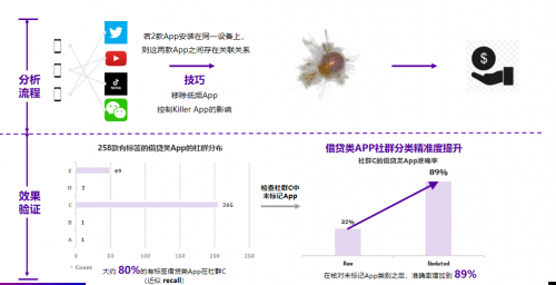 这是社区发现的一个应用案例,融慧金科做的事情是对借贷类APP进行社区分析,目的是希望提升APP分类精确度。实验设计分为分析流程和效果验证两个部分。分析流程方面首先会建构一个二部图,这个二部图基于手机设备和APP之间,能够学习APP和APP之间的关联程度。这里提供一些数据清理的小技巧,比如剔除安装比较少的长尾APP,来杜绝噪音的干扰。另外也删除了一些国民APP,比如我的设备和您的设备都安装微信,但不代表我们的微信之间有任何关联度。在最终的效果验证中,利用图模型自动识别、更新未被人工标记的应用标签后,对比传统的人工标注的APP精度,准确率能够从32%提升至89%,效果十分显著。