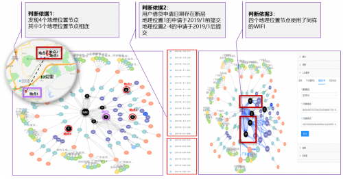案例一是团伙欺诈识别的案例,对象是一个线下做非法贷款的中介,中介虽然做了搬家的处理,但是融慧金科有效的在他搬家之后仍然能够抓到这个中介的特征。具体来看,最左边这个团簇是最大规模的一个团簇,策略人员在分析这个团簇的时候发现里面有四个比较可疑的地点,其中3个地点集中在一块,两个地点相隔10公里。进一步结合时间轴去看,发现该中介集中贷款申请批次分成两批,第一批在2019年1月份之前在第一个地点,第二批是在2019年2月份之后,在第二、第三和第四个地点。再进一步分析,发现其实是中介机构地点的转移,他第一次在地点一的时候被融慧金科的风控策略给拦截住了,这个中介也很聪明,进行搬家,搬到十公里之外的一个地点。但是这些犯罪分子不舍得把他的路由器给丢掉,带着路由器去到新地点。但是路由器背后的SSID已经被我们的系统拉黑了,所以通过这个办法有效的阻止了团伙欺诈。
