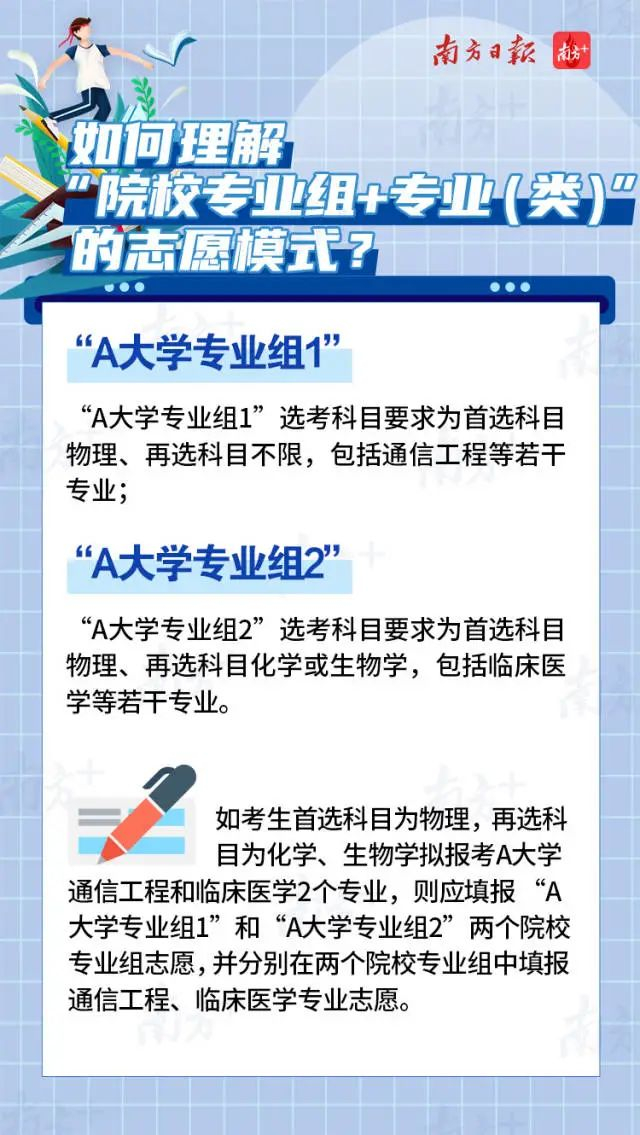 省教育考试院介绍,志愿填报与投档录取采用“院校专业组+专业(类)”模式。“院校专业组”指的是某一高校对考生选考科目要求相同的专业(类)的组合。一所院校可设置一个或多个“院校专业组”,每个“院校专业组”内可包含数量不等的专业(类)。同一“院校专业组”内各专业(类)对考生的选考科目要求相同。同一院校选考科目要求相同的专业(类)也可分设在不同的院校专业组中。