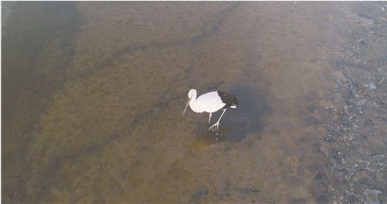 W51所在的鸟群是最先离开的种群之一。志愿者注意到,几十只与它一起组群的东方白鹳,12月后就没再回过“安心池塘”。到12月2日,数千只东方白鹳像是在一夜间消失,整个池塘就剩下W51一只鸟。它的周围,大片裸露的塘底已经干裂,上面覆盖一层白色,那是在此觅食的水鸟留下的粪便,证明着当时的盛况。